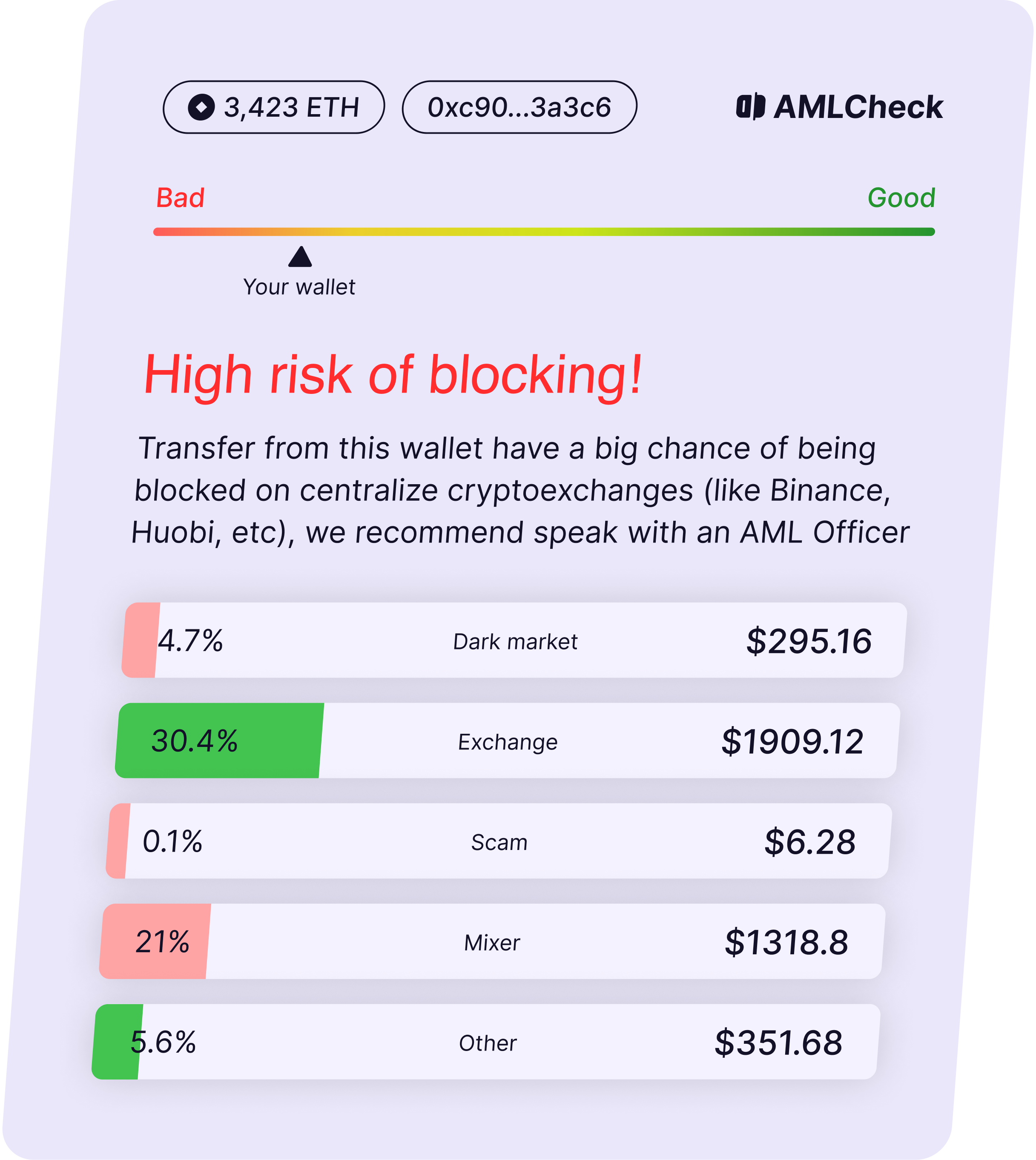 By checking your counterparties' wallets before a transaction, you can reject their assets if your risk score is high. You can also check your wallet address before transferring funds to other services and save the result (take a screenshot). If the check showed that your assets had no connection with illegal activity, and the service blocked you, you can provide the saved result to confirm the purity of your assets.